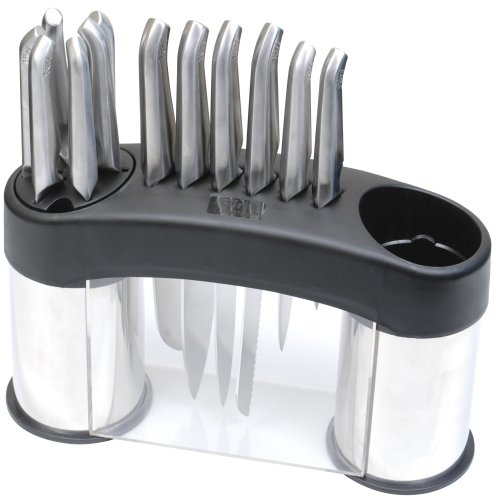 Füri Pro knife set. The set includes: 6 straight-edged steak knives; 3-1/2-inch paring; 6-inch serrated utility; 7-inch scalloped East/West; 8-inch carving; 8-inch bread; and 8-inch cook's; Ozitech sharpener; storage stand. 14 pieces total.